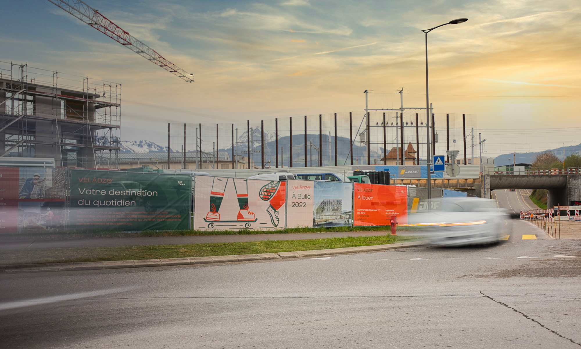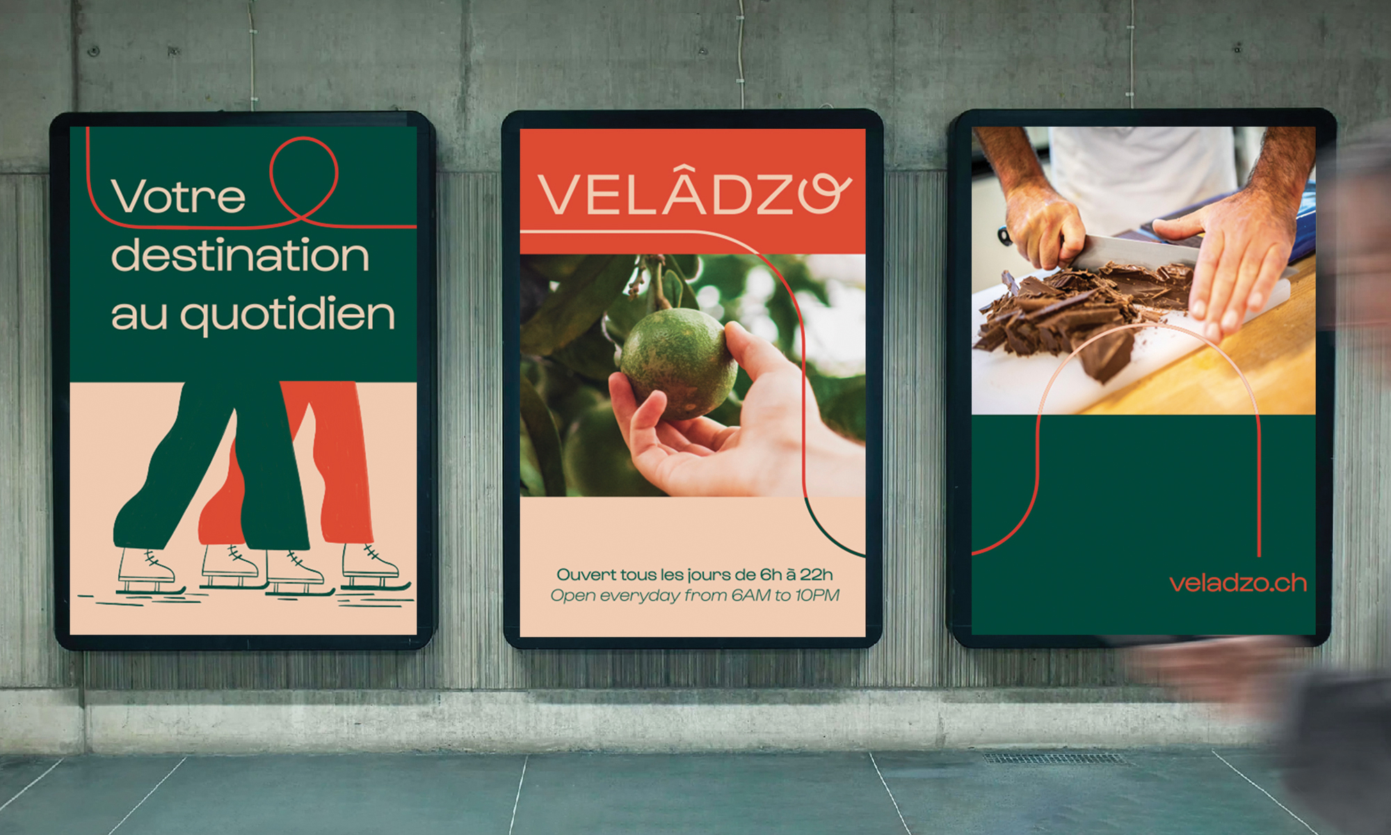 The brand was developed based on the first site at Bulle station. Movement (transport, flow of people, etc.), heritage and the environment were central elements that influenced the choice of natural hues, as well as the creation of dynamic illustrations and the logo, in which the “O” retakes the idea of gesture, from left to right, always moving forward and towards the future.